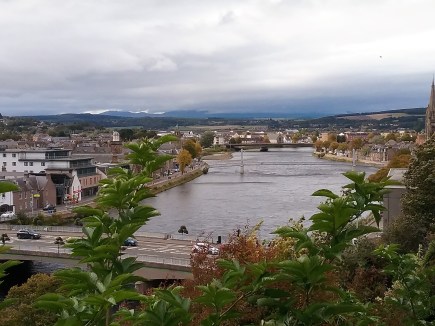 The beautiful River Ness flowed through the city below us, in much the same way that the Fox River curved through my hometown. The trees around us were just beginning to hint at the colors of the coming autumn. Ancient church spires and towers rose grandly from among the more modern buildings.